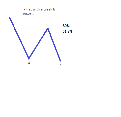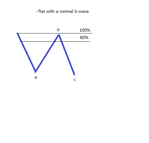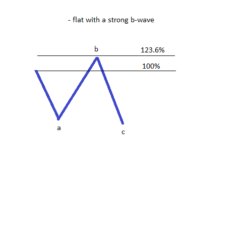 In questa categoria sono incluse alcuni pattern flat la cui onda b è moderatamente forte, nel senso che ripercorre quasi completamente la precedente onda a. È importante prendere in considerazione solo la fine dell’onda b come punto per interpretare il livello di ritracciamento, e non il punto massimo o minimo del pattern. Se l’onda b ritraccia tra l’80% e il 100% ci sono tre possibili tipi di flat, sulla base della stessa interpretazione della lunghezza dell’onda c: