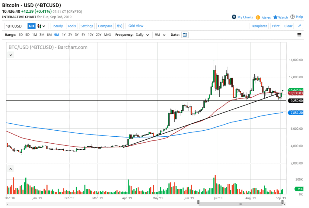 It now appears that we should be paying more attention to the fact that the $9250 level has offered support. As a result, it’s highly probable that it’s the bottom of the overall consolidation. With that being the case, it’s very likely that we are going to continue to try to grind to the upside, given enough time.