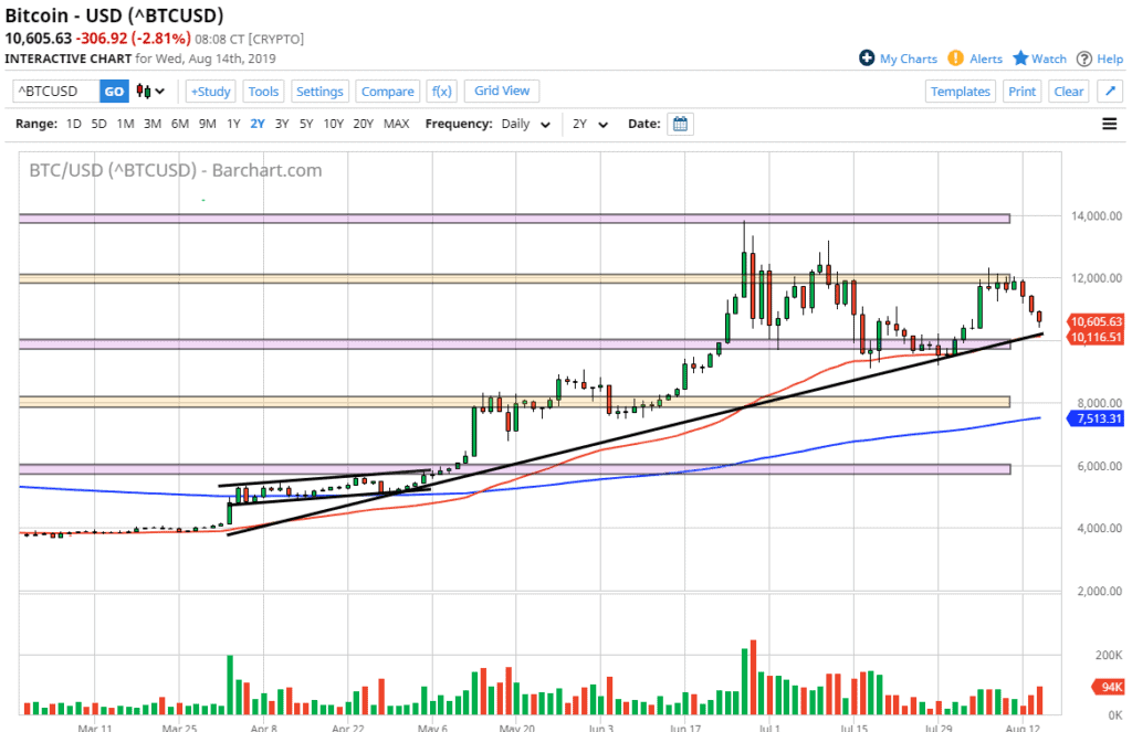 Bitcoin fell initially during the trading session on Wednesday, reaching down towards the $10,500 level. There is a major trend line slicing through the $10,000 level currently, so it makes sense that we could see a bit of a bounce from here. This is a market that continues to see a lot of upward pressure, and quite frankly there are a lot of reasons out there that could continue to push this market higher, but at this point it’s very likely that the market is going to eventually find buyers.