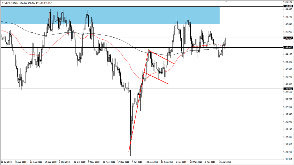 There is a certain amount of support built into this area though, because not only does the ¥145 level attract a lot of attention, we also have the 50 day EMA, pictured in red, and the 200 day EMA pictured in black. Because of this, there is a confluence of support and buying pressure here. However, the 147 level above is an area that we need to get past, and it should be resistance.