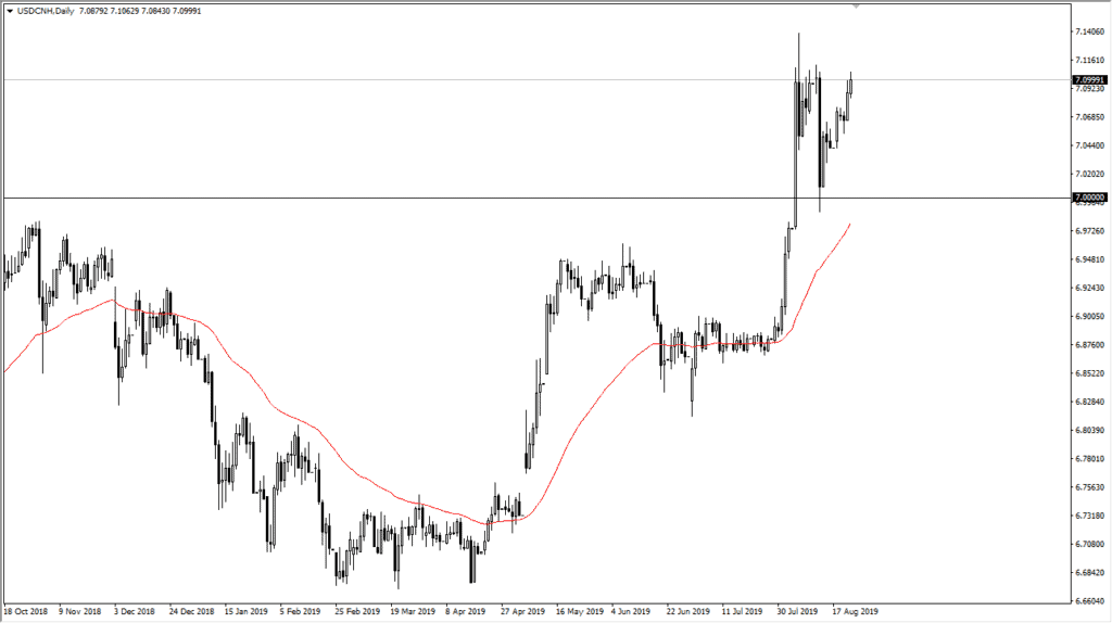 The Chinese yuan lost a bit of strength after this announcement, as money flushes into the Treasury markets, and of course traders bet on the United States and not so much China when it comes to these situations. After all, with the Chinese economy being so export dependent, it makes sense that the Chinese could suffer a bit more than the Americans, as the US economy is much more dynamic than China. At this point, you can see that the Chinese offshore yuan has broken back towards the 7.10 level during early trading on Friday. All of this against the backdrop of the markets waiting on what the Federal Reserve will do next.