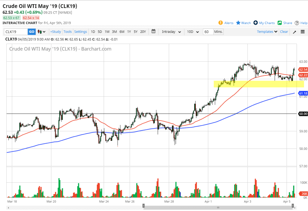 Looking at the WTI Crude Oil markets, we continue to show strength as we reach towards the $63 level. This is a market that is highly sensitive to the economic conditions in the United States, and with the jobs number coming out on Friday, it suggests that things are going quite well. Beyond that, we have several other fundamental factors that can come into play.