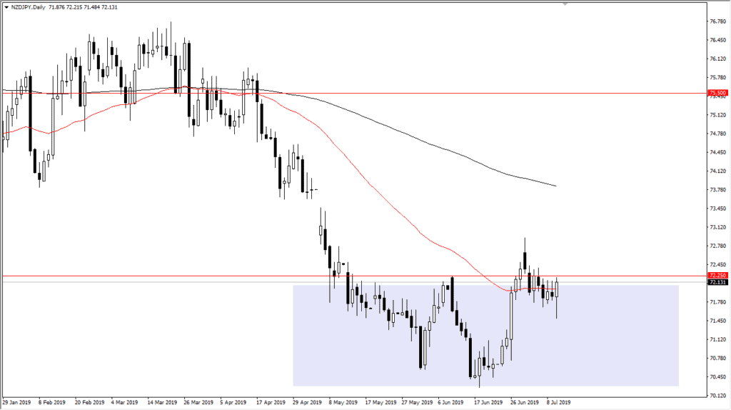 The New Zealand dollar initially fell during the trading session on Tuesday, dipping as low as ¥71.50 before turning around and rally. At this point, it looks as if there’s more of a “risk on” move coming into the marketplace, as we continue to test the ¥72.25 level. This perhaps is due to the statement coming out of the Federal Reserve in front of Congress suggesting that interest rate cuts are in fact coming, which in general is going to be good for risk appetite around the world.