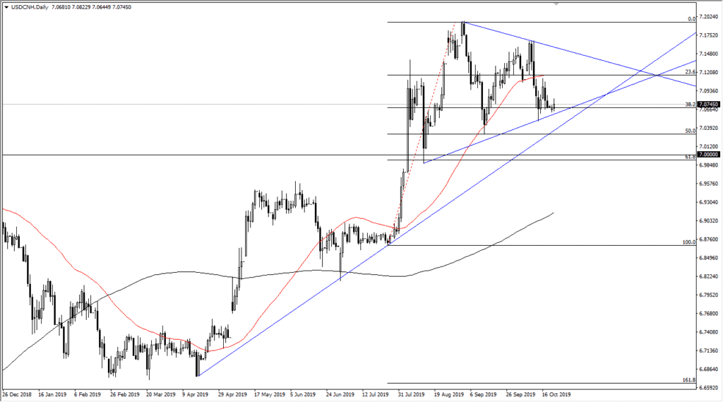 The US dollar trading against the Chinese yuan is one of the more important currency pairs to watch currently, because of the US-China trade situation that we find ourselves in. It is simply one headline after another that contradicts the previous one, therefore it should continue to be very noisy.